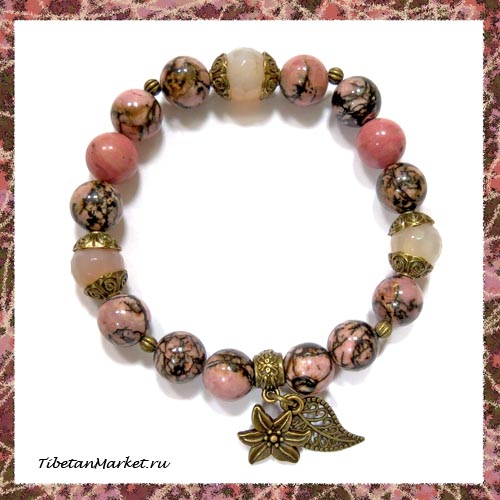 Браслет ручной работы из металлической фурнитуры и натуральных камней: розового кварца, тулина №TIB-526